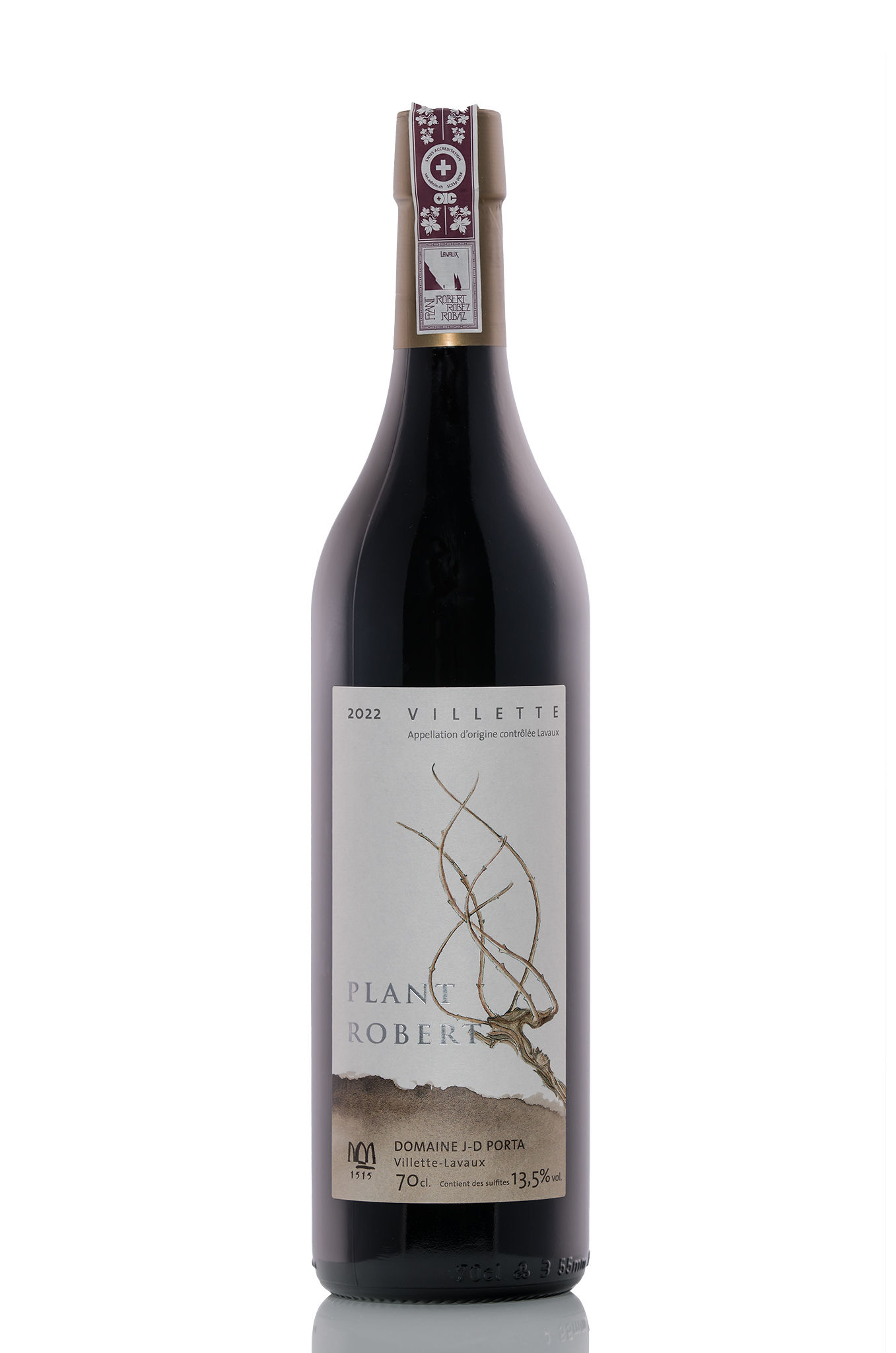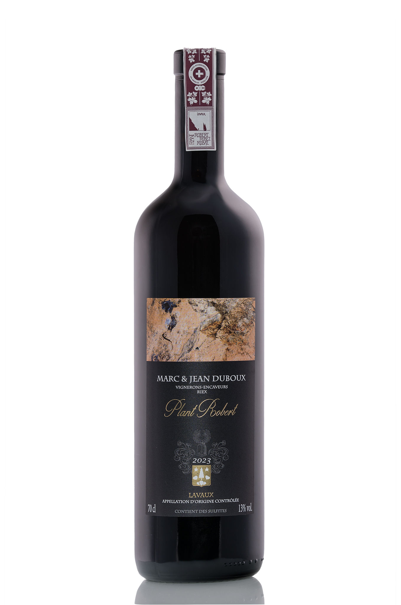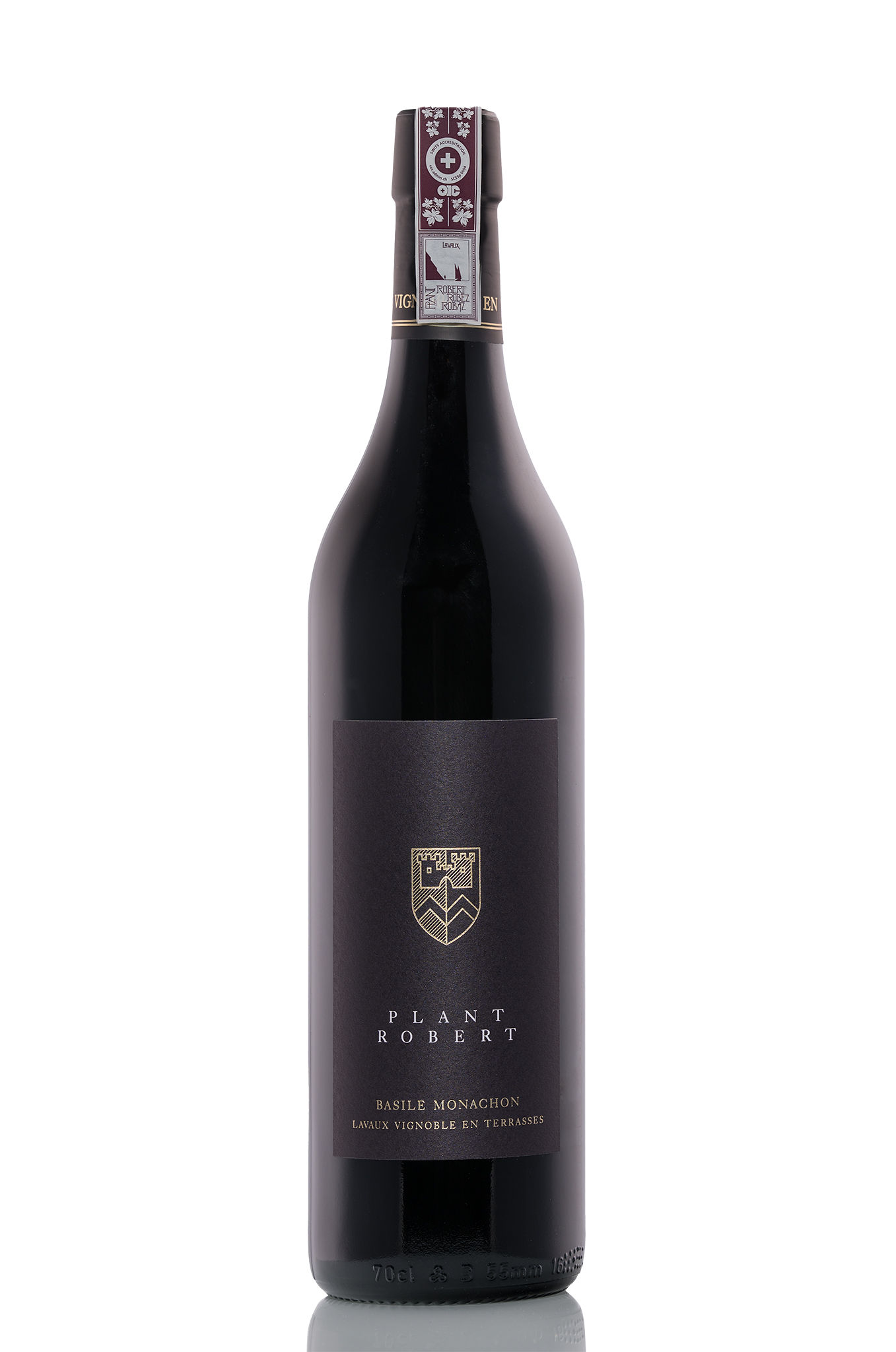 Juché sur les hauteurs du vignoble de Lavaux, classé en 2007 au patrimoine mondial de l’UNESCO, notre domaine familial s’étend entre ciel et lac. Notre cave surplombe ce magnifique paysage et c’est là que nous élevons nos crus avec le plus grand soin. Très peu mécanisé, nous cultivons nos vignes selon des méthodes respectueuses de l’environnement (production intégrée). La récolte est ensuite élevée et mise en bouteilles à la propriété. C’est dans ce cadre que nous mettons en valeur le cépage Plant Robert sur 3 différentes petites parcelles au terroir différent.L’élevage du vin se fait ensuite dans des doubles barriques de 500 litres.Ainsi ce cru révèle toute sa personnalité, son caractère légèrement sauvage et épicé.